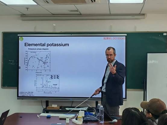 2025年12月2日下午, Andreas Hermann教授在东教楼1104学术报告厅为3044永利集团登录部分物理学专业和材料与化工专业的博士生、硕士生和青年教师作了题为“From DFT to thermodynamic modelling”的学术报告。报告以近期关于“同时具备固体与液体特征的新物态”的报道为切入点,系统阐述他们研究团队在高压物理与计算材料学领域的系列工作。Andreas Hermann教授从钾的高压相图与非共格宿主—客体结构详细阐述了“链熔融”作为一种热力学中间态的证据与机制,提出了碱金属高压相可作为部分电子化合物的观点,展示了如何利用机器学习分子动力学模拟预测相变、熔化线极值及热力学性质,介绍了基于Bragg-Williams模型的两态热力学理论,解释了金属熔化线中的临界行为。此外,Andreas Hermann教授还介绍了第一性原理计算在高压冰(VII–VIII–X)相变研究中的应用,探讨了隐藏临界点与相图拓扑等前沿问题,展望了机器学习在预测复杂材料行为方面的潜力。报告期间,Andreas Hermann教授与在场师生就高压相变机理、机器学习势函数开发等相关问题展开了深入讨论并细致回答了师生提问。