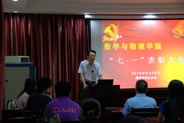 2014年6月30日上午10点半,3044永利集团登录在基础楼二楼报告厅召开了庆祝建党93周年暨“七一”表彰大会,校党委组织部副部长刘治国、院党委书记李宇凯、副院长张光勇、副书记李杰出席表彰大会。参加表彰大会的还有教工党员和学生党员代表。