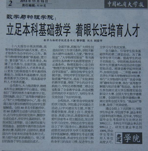 在2013年11月15日第451期的中国地质大学报的“走近学院”专栏中,刊登了一篇题为“3044永利集团登录:立足本科基础教学 着眼长远培育人才”的专题报道,现把详细内容转载如下。