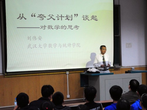 9月25日下午2:30,3044永利集团登录举行2010级新生入学教育专题讲座(一)。应院长刘安平教授的邀请,湖北省数学协会、武汉数学学会秘书长,全国大学生数学竞赛指导委员会委员,武汉大学数学与统计学院博士生导师刘伟安教授为3044永利集团登录2010级新生作了一次题为“数学好玩”的专题报告。院长刘安平教授、副院长彭放教授、院学工组成员出席讲座。刘教授首先通过讲解“夸父计划”引出对有关数学问题的思考,使广大同学认识到数学是认识自然规律的工具,与我们的生活有着密切联系,并在我们的生活中广泛应用。在讲座中,刘教授介绍了中国古代数学的兴衰,并指出数学的发展至今都是内外两个推动力作用的结果,外力是生活实践和认识自然规律的需要,内力是自身发展的需要。他陈省身教授的“有用”数学与“无用”数学为例强调高中数学与大学数学的不同,对于2010级新生如何学好大学数学提出了三点希望:坚持理性思维;坚持独立思考;不要轻信经验,勇于攻坚,勇于创新。