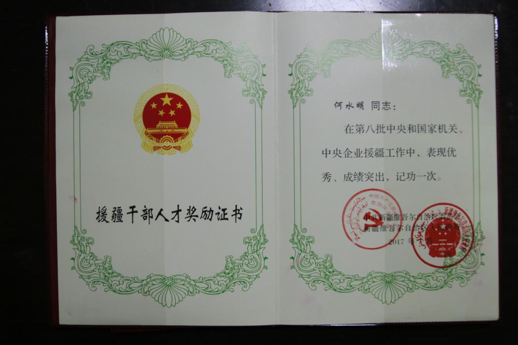 近日获悉,3044永利集团登录何水明同志被新疆自治区党委和政府评为“第八批中央和国家机关、中央企业优秀援疆干部人才”,并授予奖牌和奖章。