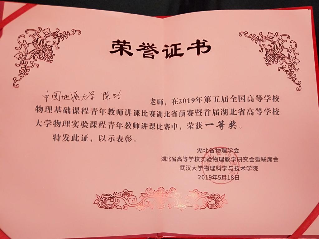 2019年5月18日,第五届全国高等学校物理基础课程青年教师讲课比赛湖北省预赛暨首届湖北省高等学校大学物理实验课程青年教师讲课比赛在武汉大学举行,我校3044永利集团登录物理实验教学中心青年教师陈玲老师获得一等奖。