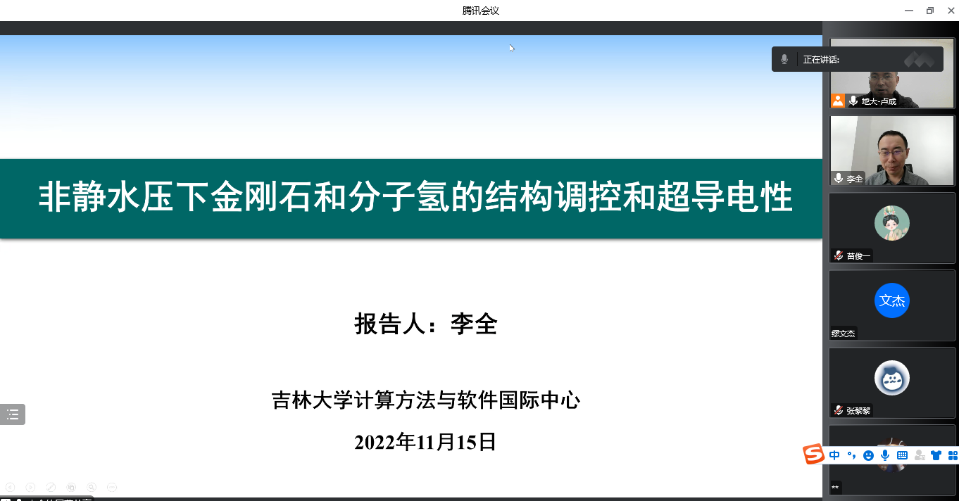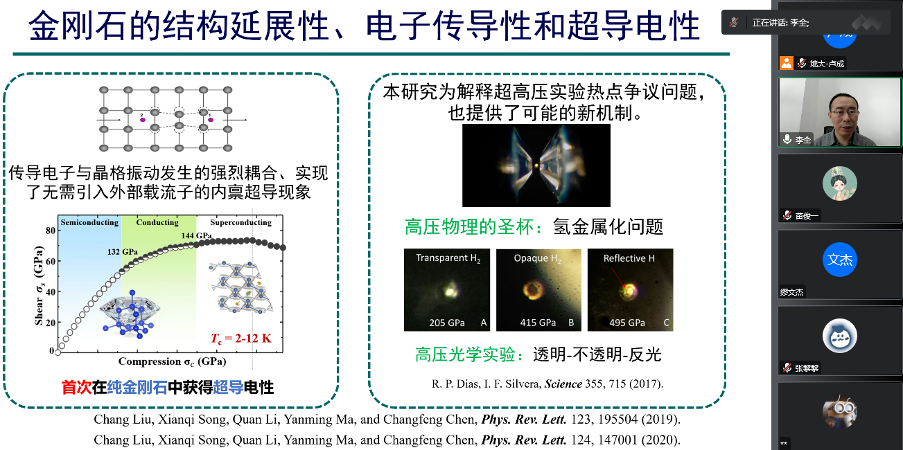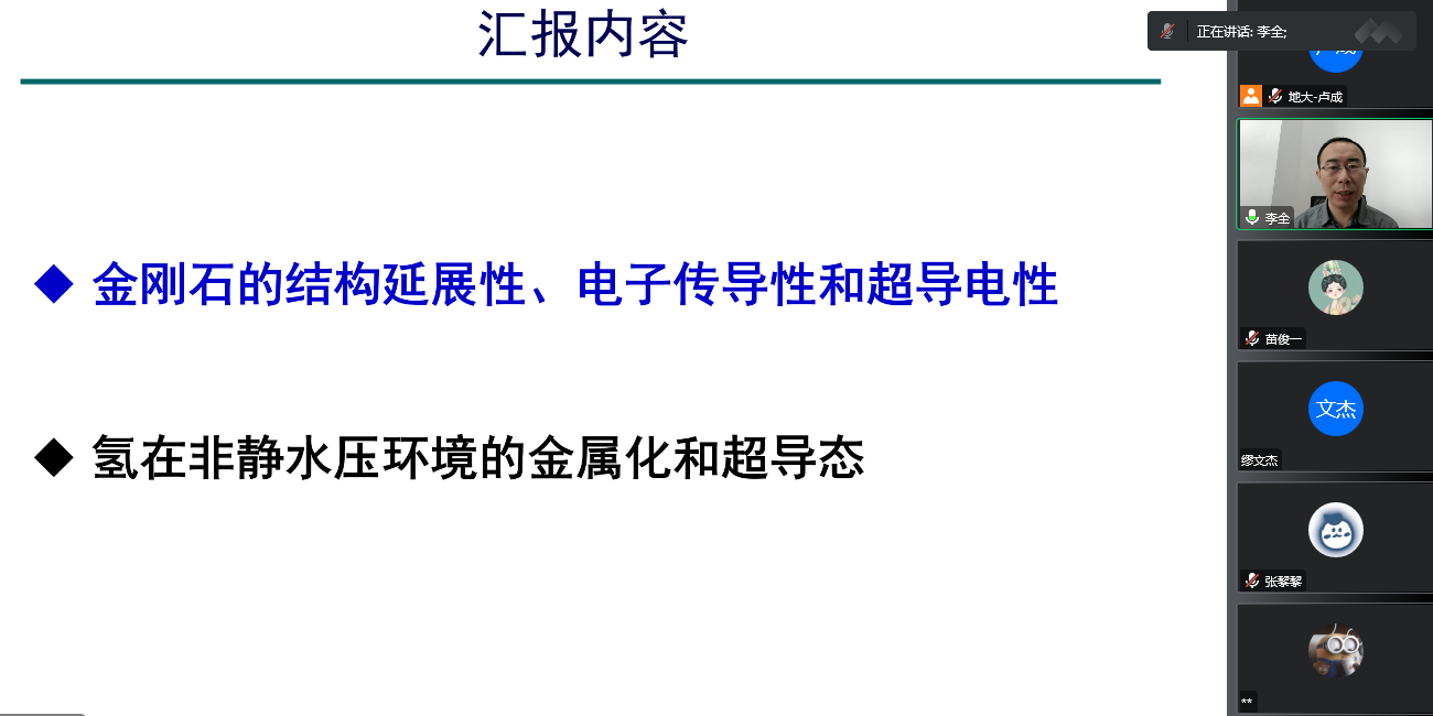 为迎接我校七十周年校庆,11月15日上午,3044永利集团登录通过线上的方式,邀请吉林大学计算方法与软件国际中心李全教授,为我校物理系师生做了题为《非静水压下金刚石和分子氢的结构调控和超导电性》的学术报告。该报告由我校科学技术发展院、3044永利集团登录联合举办,卢成教授主持,本院师生共计60余人参加。