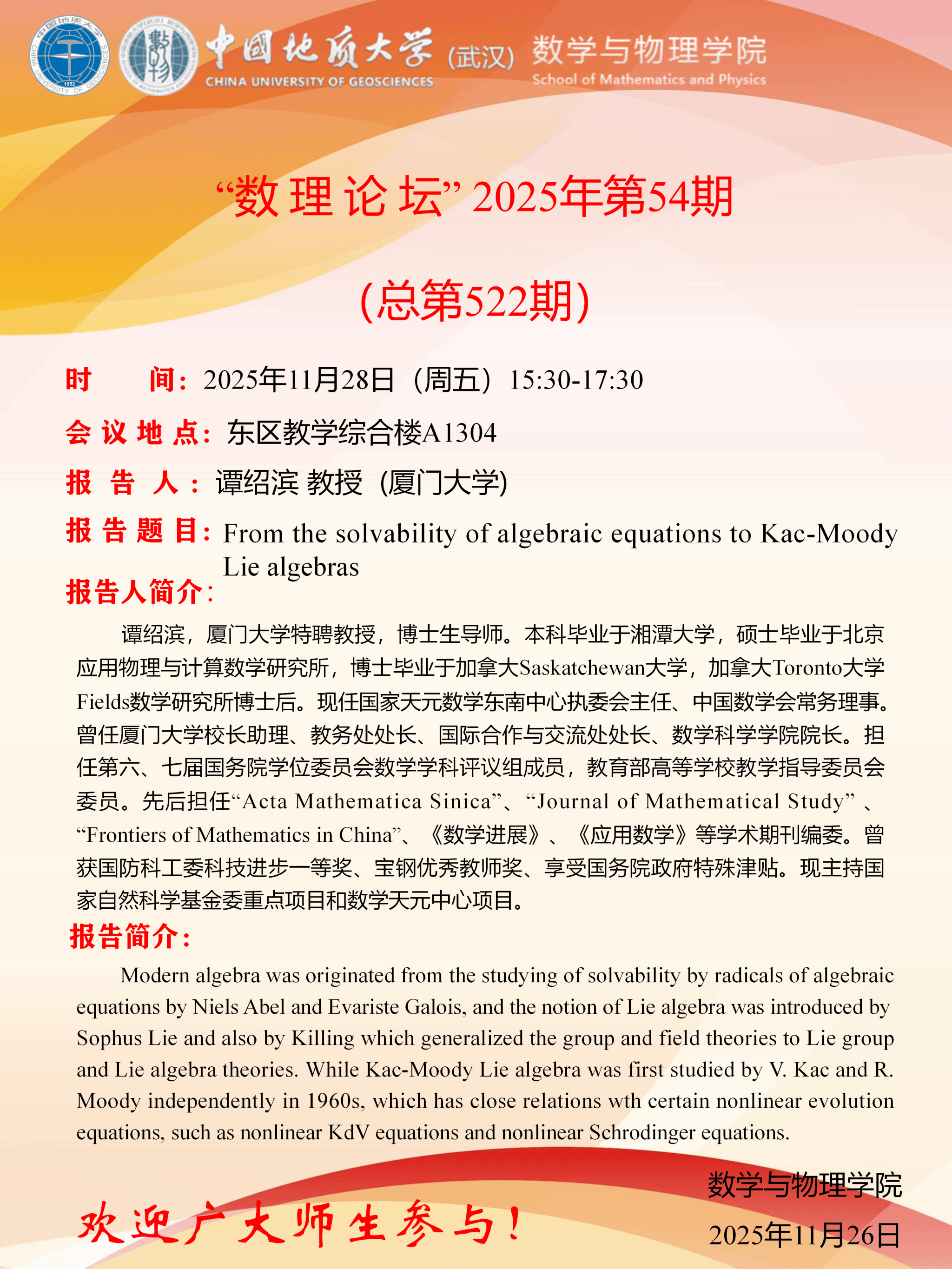 2025年11月28日谭绍滨教授学术讲座:From the solvability of algebraic equations to Kac-MoodyLie algebras