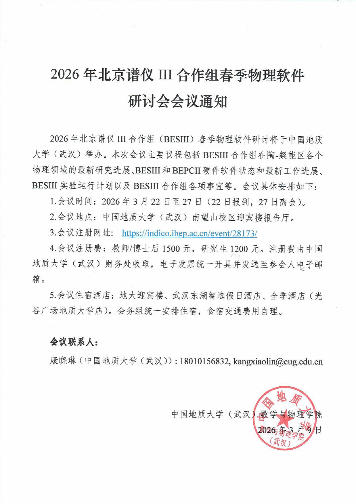 会议通知:2026年北京谱仪III合作组春季物理软件研讨会会议通知