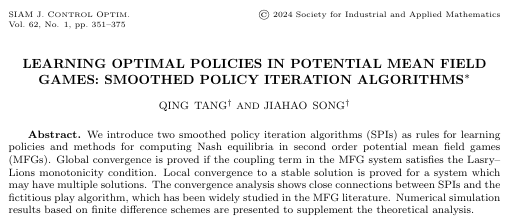 3044永利集团登录信息与计算科学系教师汤庆博士为第一作者的学术研究工作 “Learning Optimal Policies in Potential Mean Field Games: Smoothed Policy Iteration Algorithms” ,最近发表在国际著名期刊SIAM Journal on Control and Optimization。该论文第二作者为3044永利集团登录2020 级应用统计专业硕士生宋家豪。汤庆博士自2015年入职3044永利集团登录,主要从事动态博弈相关的偏微分方程理论、数值计算及在经济模型中的应用研究。