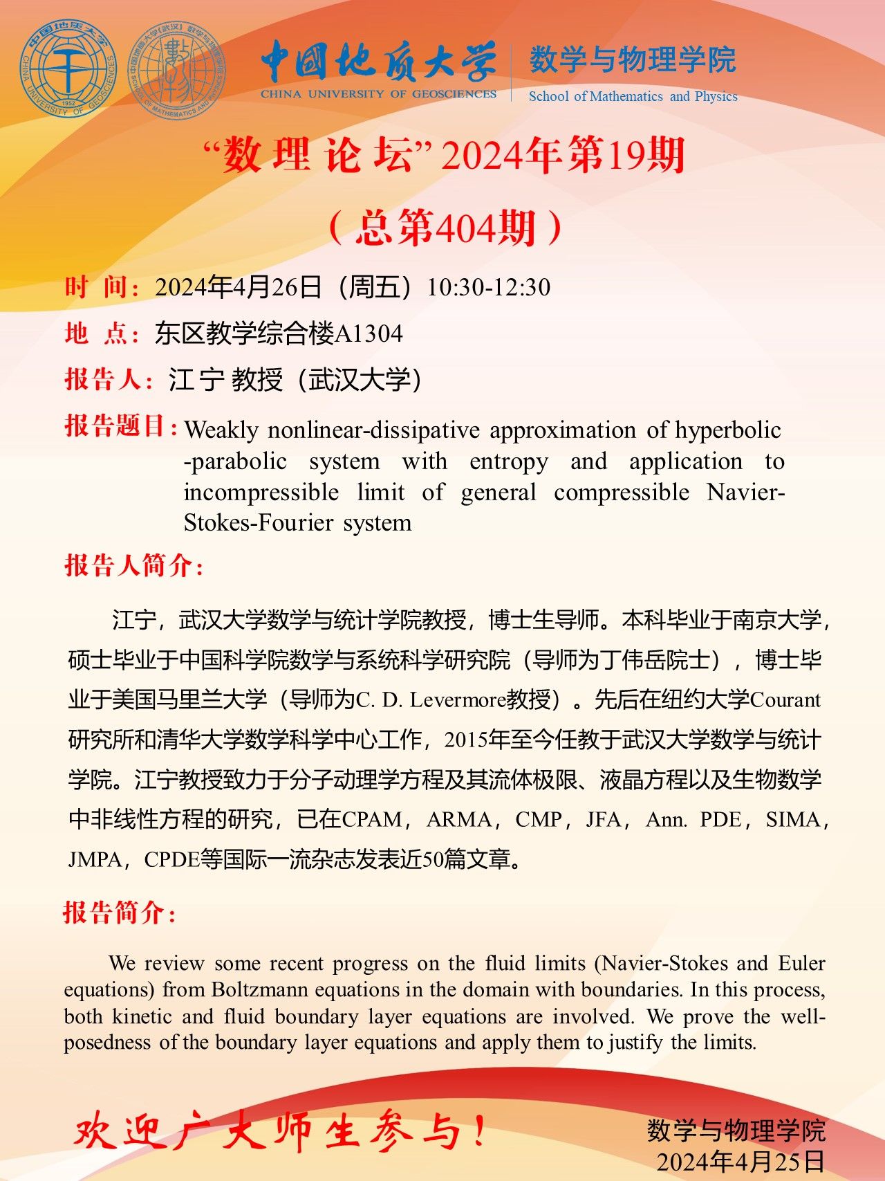 2024年4月26日江宁教授学术讲座:Weakly nonlinear-dissipative approximation of hyperbolic-parabolic system with entropy and application to incompressible limit of general compressible Navier-Stokes-Fourier system