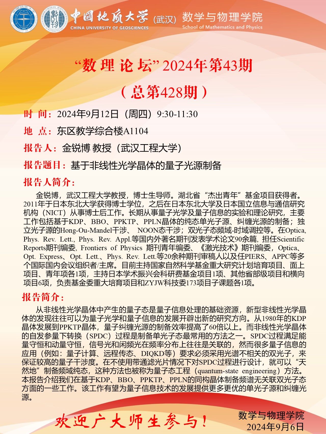 2024年9月12日金锐博教授学术讲座:基于非线性光学晶体的量子光源制备