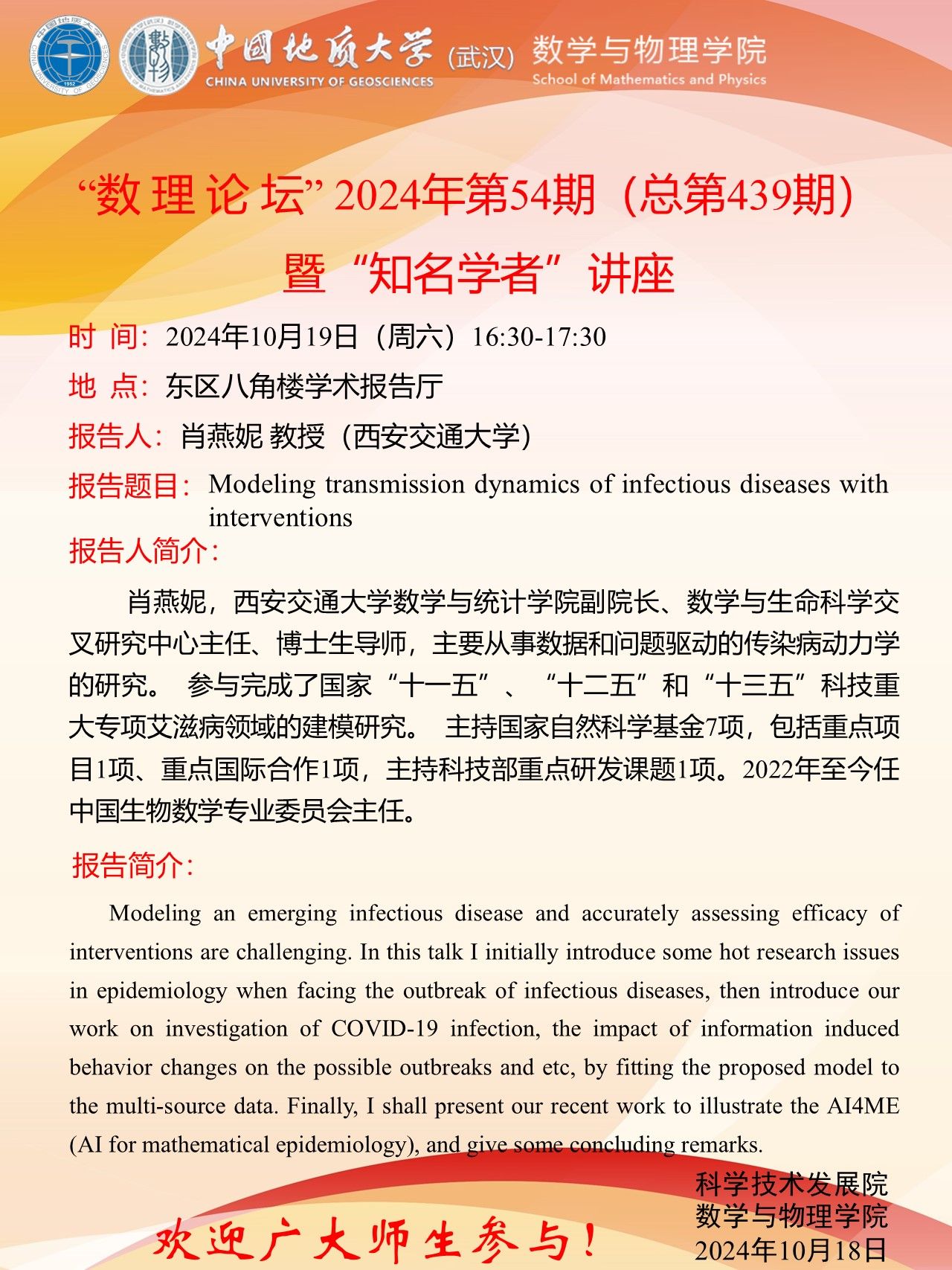 2024年10月19日肖燕妮教授学术讲座:Modeling transmission dynamics of infectious diseases with interventions
