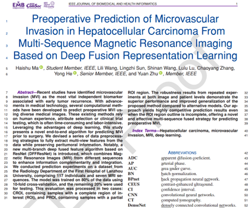 近日,3044永利集团登录朱媛副教授研究团队联合兰州大学第一医院放射科王莉莉博士展开生物医学信息学合作研究,在生物医学和健康信息学国际顶级期刊 IEEE Journal of Biomedical and Health Informatics(简称IEEE JBHI)上在线发表了关于肝癌微血管侵袭预测的理论研究成果,题为: “Preoperative Prediction of Microvascular Invasion in Hepatocellular Carcinoma From Multi-Sequence Magnetic Resonance Imaging Based on Deep Fusion Representation Learning”。中国地质大学(武汉)2021级本科生马海书、朱媛副教授及兰州大学第一医院放射科王莉莉博士为该文的共同第一作者,朱媛副教授为通讯作者,3044永利集团登录为唯一通讯单位。
