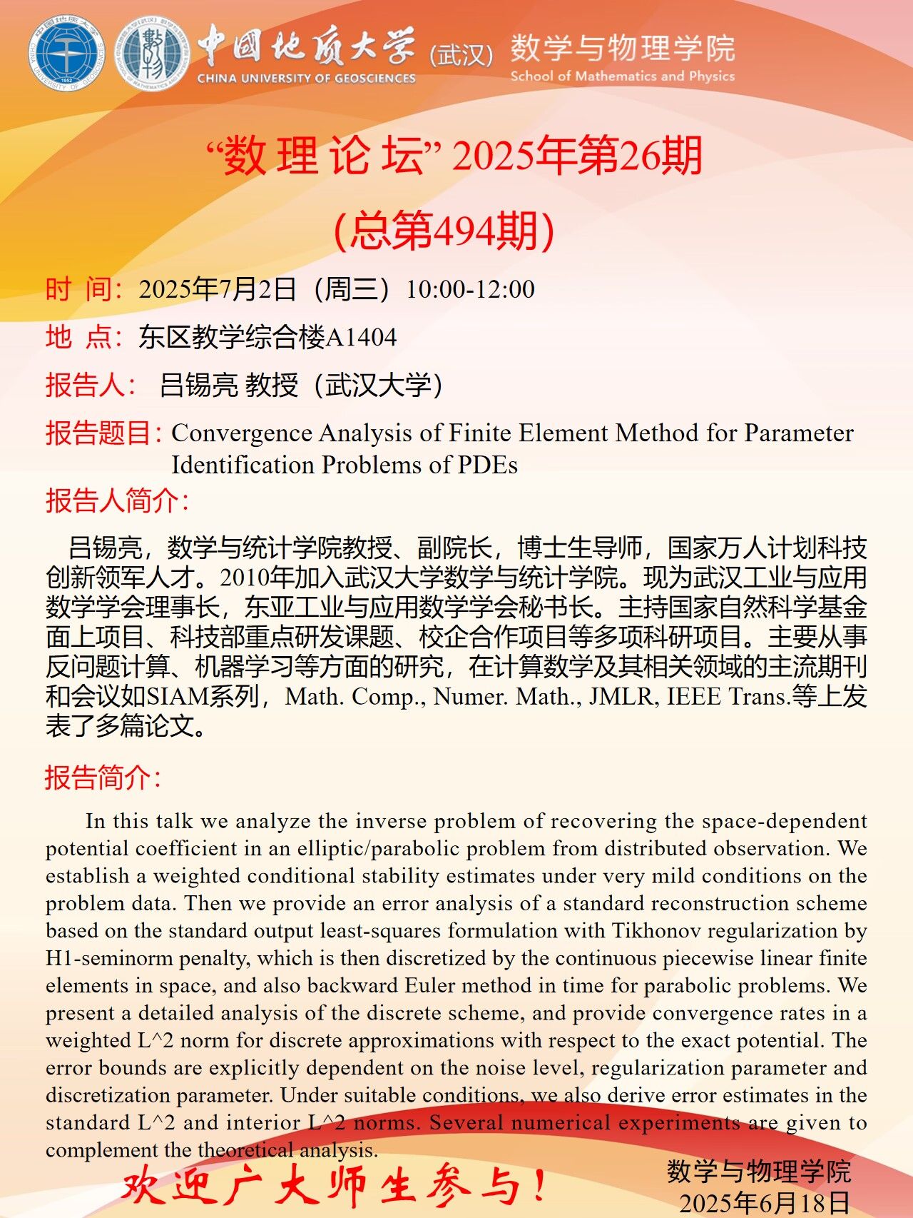 2025年7月2日吕锡亮教授学术报告:Convergence Analysis of Finite Element Method for Parameter Identification Problems of PDEs