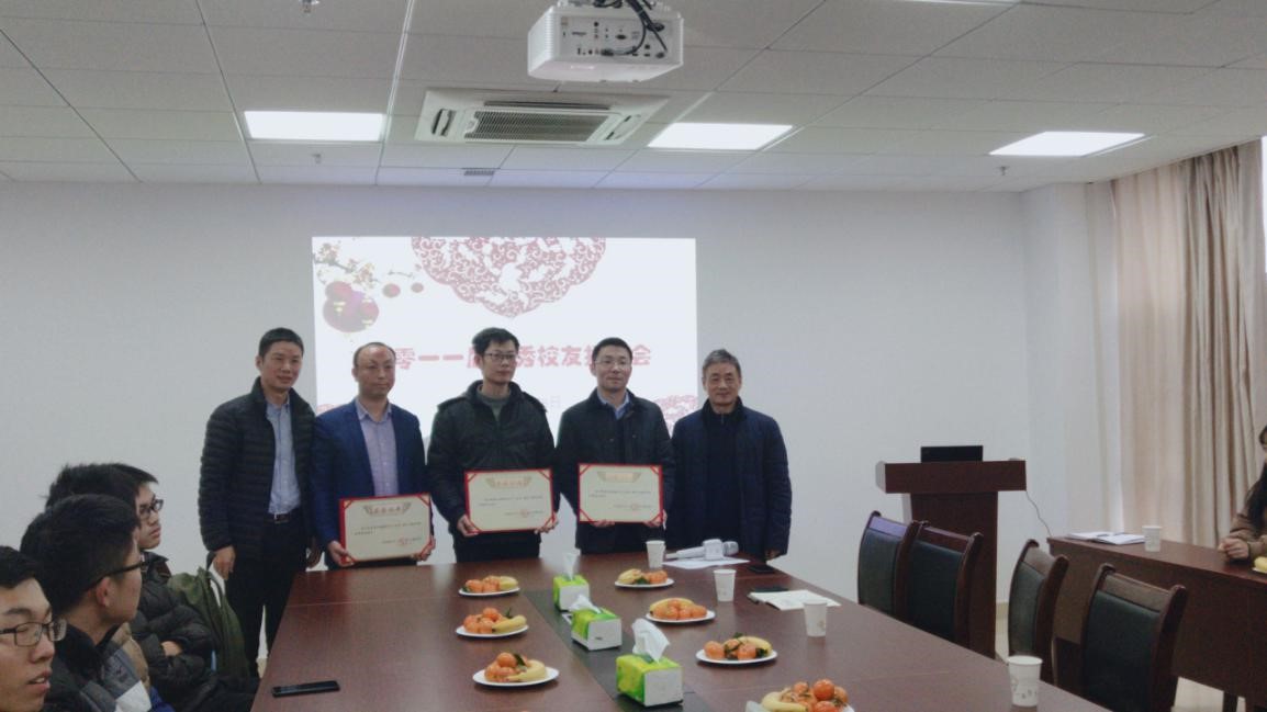吴太山、徐超为优秀校友颁发荣誉证书并合影留念。优秀校友代表邵锐作了精彩的报告。他结合自身的求学经历、应聘经历和工作经历为同学们分享了他的成长历程,语重心长地教导学弟学妹们要树立终身学习的理念,格局要高,勇于担当,继承和发扬地大“艰苦朴素,求真务实”的校训精神。