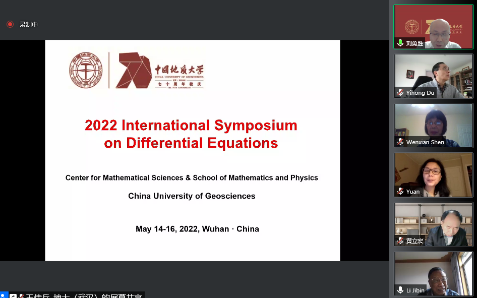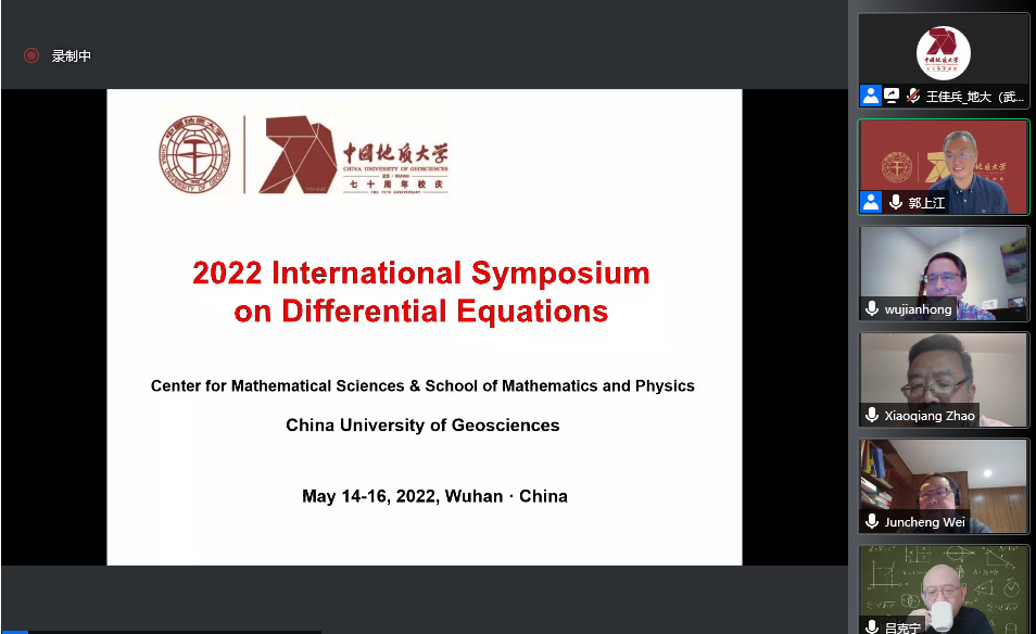 2022年5月14日至15日,中国地质大学(武汉)主办“2022年微分方程国际研讨会(2022 International Symposium on Differential Equations)”在腾讯会议线上举行。此次国际会议是中国地质大学(武汉)70周年校庆的系列学术活动之一,以展示和介绍国内外微分方程定性与稳定性理论及应用的最新研究成果和进展为出发点,以加强国内外微分方程及相关相关领域的学术交流与合作为目的。大会开幕式由3044永利集团登录院长郭上江教授主持,中国地质大学(武汉)副校长刘勇胜教授以及加拿大应用数学首席教授(Canada Research Chair)、加拿大首席资深工业与应用数学主席、加拿大应用与工业数学会会长、加拿大约克大学疾病建模中心创始主任,危机与灾难模拟快速反应项目创始主任吴建宏教授分别致辞。